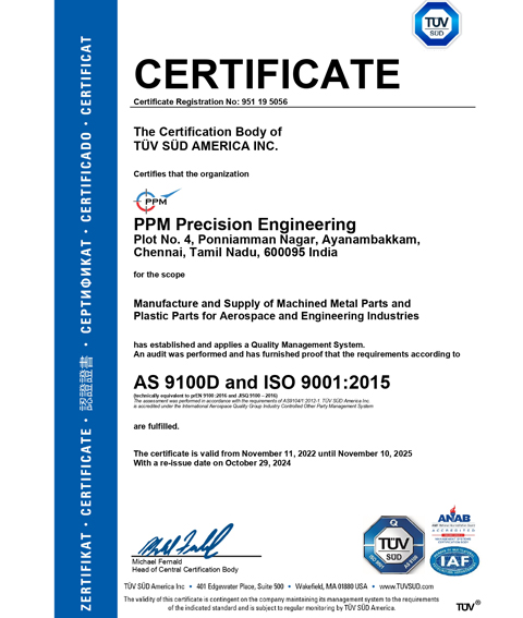 At PPM PRECISION ENGINEERING, we strive to provide defect free components to our customers and we pride ourselves in our consistent high-quality “first time right” performance.We are accredited with AS 9100 Rev. D and ISO 9001:2015 for manufacturing and supply of machined metal and plastic parts. We are now fully compliant with the standards called-for by worldwide aerospace clients and has opened up valuable new opportunities in the aviation and space industries.